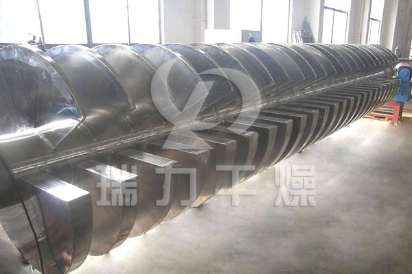 空心軸上密集排列著楔型中空槳葉,熱介質經空心軸流經槳葉。單位有效容積內傳熱面積很大,熱介質溫度從-40℃到320℃,可以是水蒸汽,也可以是液體型:如熱水、導熱油等。間接傳導加熱,沒有攜帶空氣帶走熱量,熱量均用來加熱物料。熱量損失僅為通過器體保溫層向環境的散熱。楔型 槳葉傳熱面具有自清潔功能。物料顆粒與楔型面的相對運動產生洗刷作用,能夠洗刷掉楔型面上附著物料,使運轉中一直保持著清潔的傳熱面。槳葉干燥機的殼體為W型,殼體內一般安排二到四根空心攪拌軸。殼體有密封端蓋與上蓋,防止物料粉塵外泄及收集物料溶劑蒸汽。出料口處設置一擋扳,保證料位高度,使傳熱面被物料覆蓋而充分發揮作用。熱介質通過旋轉接頭,流經殼體夾套及空心攪拌軸,空心攪拌軸依據熱介質的類型而具有不同的內部結構,以保證最佳的傳熱效果。